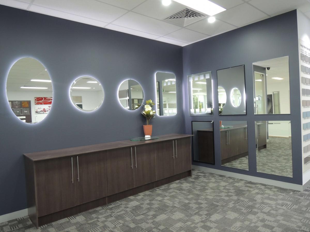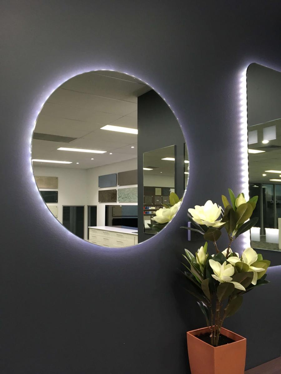 Products: Frameless mirrors, Framed wall mirrors, Custom mirrors, Bathroom mirrors with LED backlighting and defogging.